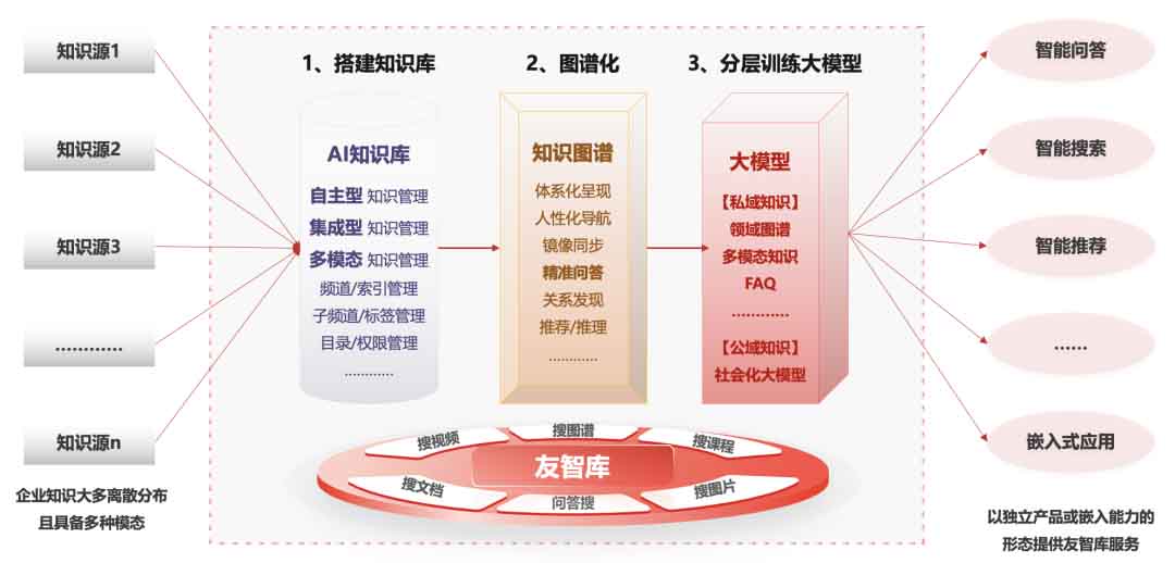 友智库帮助企业构建了多模态的知识体系与搜索入口,针对企业大量、分散的私域非结构化数据,友智库通过融合多模态大模型、AIGC与知识图谱等核心能力,提供文档、图片、音频、视频等企业内部知识的即时搜索、智能问答,帮助企业构建“知识全程伴随、知识沉淀入库”的闭环体系,实现知识的统一管理、智能应用和价值转化。