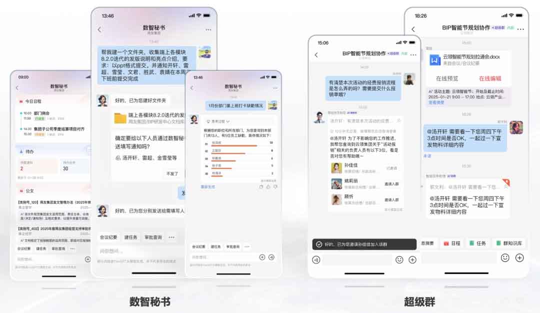 其中,数智秘书是基于通用大模型的全能智能办公助手,面向企业全员,以 AI 深度融合业务流程,颠覆传统办公模式,实现工作效率的飞跃式提升。超级群打破传统沟通群组单一属性,以人、业务、智能体为核心,提供多元化的沟通与业务处理。