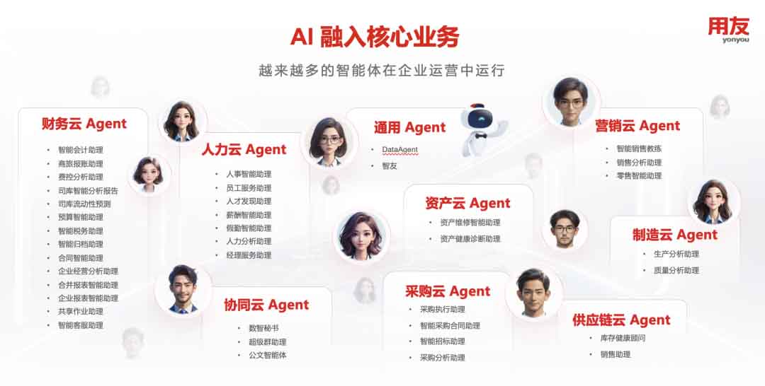 除了通用智能体之外,用友BIP还将AI与业务场景深度融合,在财务、人力、供应链、采购、制造、营销、研发、项目、资产、协同十大领域中融入40多个智能体,包括:财务领域的智能会计助理、商旅报账助理、共享作业助理、智能税务助理、司库智能分析、企业经营分析助理等;人力领域的人事智能助理、员工服务助理、人才发现助理、薪酬智能助理、人力分析助理等;覆盖整个供应链条的智能销售教练、零售智能助理、库存健康顾问、采购智能助理、生产计划助理、质量分析助理、资产维修智能助理等;以及协同领域的数智秘书、超级群助理等。