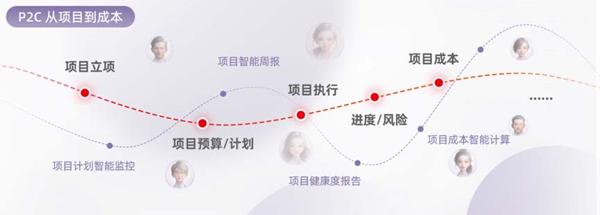 P2C从项目到成本:以项目为核心,打通“商机-销售-交付-收款”、“项目-采购-验收-付款”业财一体化链条,以项目计划为指引,对项目工作任务的下发推送、下推业务、成果物填报、进度反馈、执行完成等全流程,支持制造、工程、服务三类项目,实现从业务执行到成本核算的全链路协同。