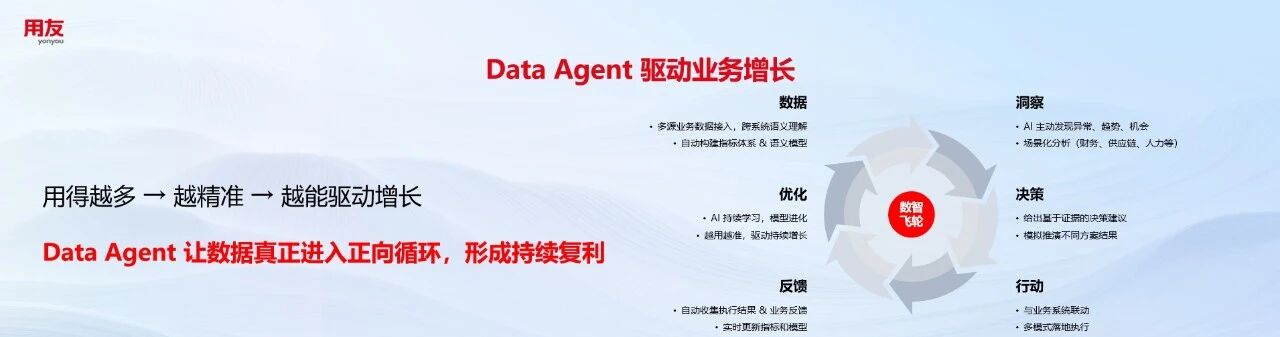 他进一步展望,未来用友将基于对数据的深度理解,沉淀出更多行业大模型,赋能企业从“事后总结”走向“事前预测”,真正实现“基于数据洞察的业务增长”。