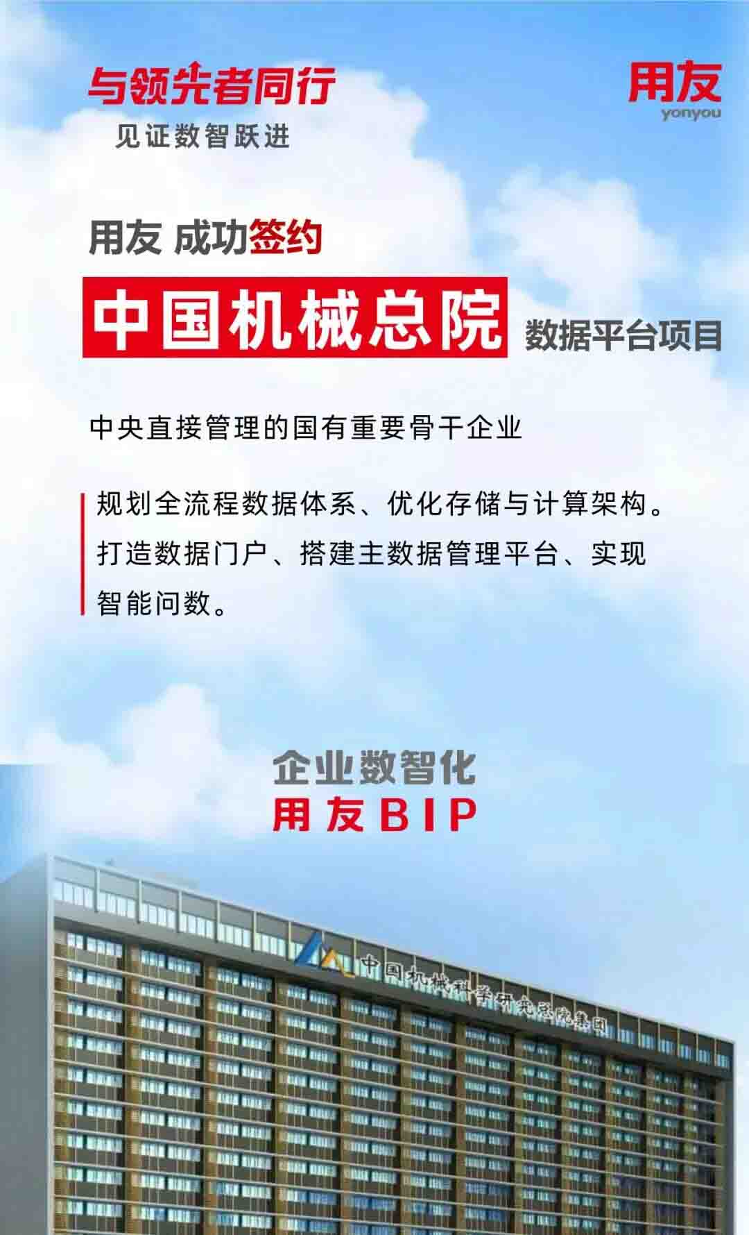近日,中国机械科学研究总院集团有限公司(简称:中国机械总院)与用友网络科技股份有限公司(简称:用友网络)签约数据平台项目。此项目将基于用友BIP统一数智底座iuap平台加速数智化升级焕新,构建统一数据体系,打破数据孤岛,实现数据资产化,支撑业务领域数据资产建设,显著提高经营管理效率,通过统一主数据标准、整合多源数据提升质量,筑牢合规报送基础;赋能业务与决策,提升核心竞争力。