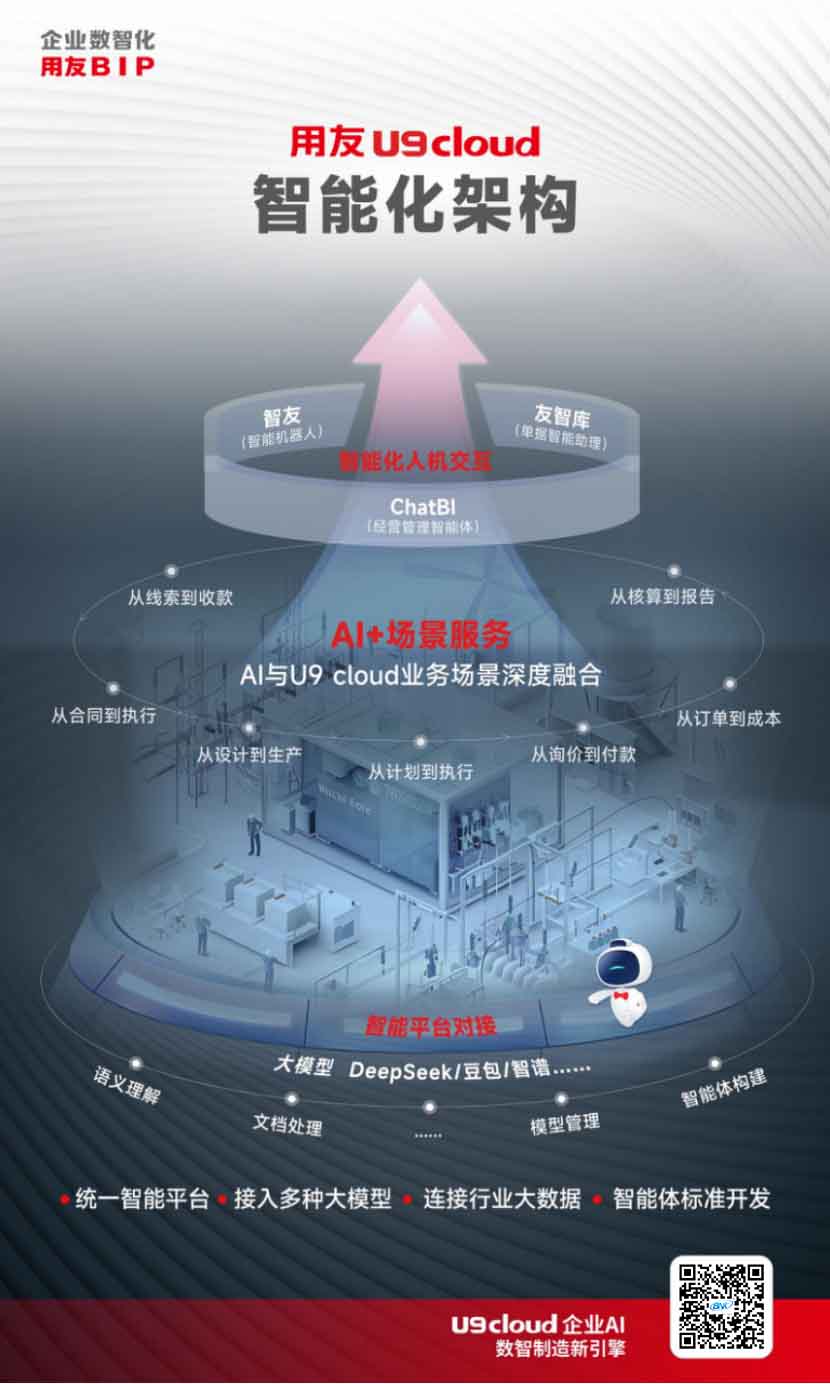 ●2025年,U9 cloud 再次迭代,以“IT 技术+管理赋能”双轮驱动,为企业提供“柔性供应能力”、“全球经营能力”和“AI+数据决策能力”三大核心竞争力,为制造企业在复杂多变的市场环境中提供“确定性增长引擎。