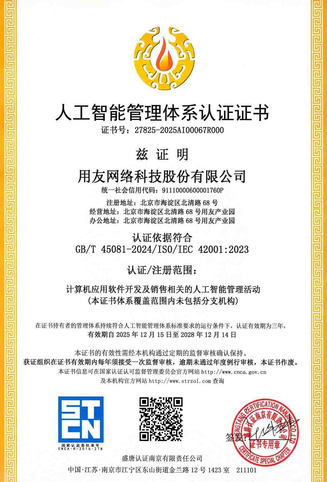 该认证由国际标准化组织(ISO)与国际电工委员会(IEC)联合发布,是全球首个人工智能管理领域国际标准,标志着用友在人工智能系统开发、部署及风险管理领域的管理能力已全面接轨国际领先水平,在技术合规性、伦理规范和数据安全等维度达到行业标杆标准。