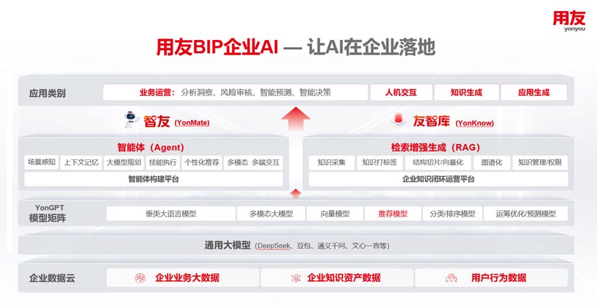 作为全球领先的企业软件与智能服务提供商,用友持续布局AI技术研发。其中,用友战略投资、倾力打造的全新一代产品——用友BIP实现了企业软件的一次换代,为企业带来全新价值。用友BIP依托创新构建的数智新架构,实现了“AI×数据×流程”的原生一体化,提供从数据层、模型矩阵层、平台层到应用层的完整能力体系,在业务运营、人机交互、知识与应用生成等多场景实现AI在企业的落地,全面赋能企业智能化升级。