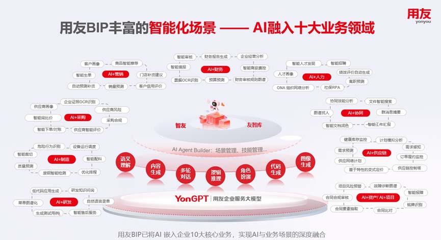 此外,用友推出的助力企业一站式落地AI应用的产品矩阵 ——“用友BIP企业AI”,包括智能平台、通用智能服务、领域智能服务,具有“统一数智底座、融入核心业务、结果可靠、安全合规”四大特性,提供满足企业级复杂场景需求的各种智能体,让AI在企业业务及管理中真正释放价值。