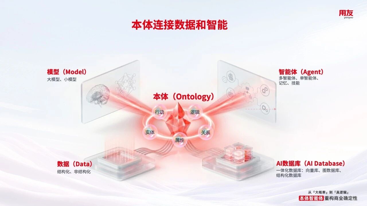 BIP“本体智能体”(Ontology-Driven Agent)植根于用友37年深耕企业服务领域沉淀的行业Know-how,本体(Ontology)为核心纽带,连接结构化与非结构化数据,打通智能体、模型、数据、AI数据库的协同链路,通过对业务实体、关系、流程与状态变化的全面建模,构建出与真实业务运营实时同步、可交互且动态演进的数字孪生。